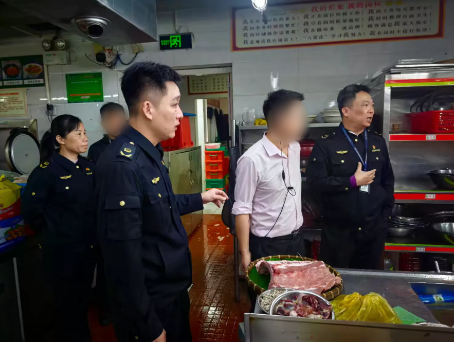 副局长袁崇滔带队查抄辖区衔接大年夜饭的餐喝酒店、大型餐厅和特色餐饮店,从业人员健康办理、原材料进货检验、索证索票轨制落实、后厨卫生、生熟分隔加工、餐器具清洗消毒、食物留样等环境,峻厉查处利用过时变质食材、来历不明原料、操做流程不规范等违法违规行为。