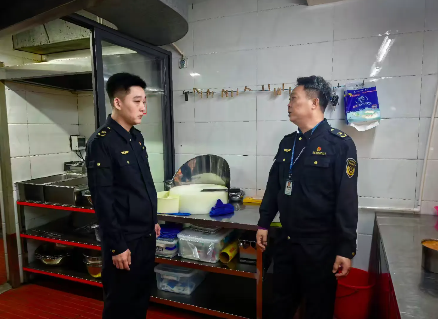 副局长袁崇滔带队查抄辖区衔接大年夜饭的餐喝酒店、大型餐厅和特色餐饮店,从业人员健康办理、原材料进货检验、索证索票轨制落实、后厨卫生、生熟分隔加工、餐器具清洗消毒、食物留样等环境,峻厉查处利用过时变质食材、来历不明原料、操做流程不规范等违法违规行为。